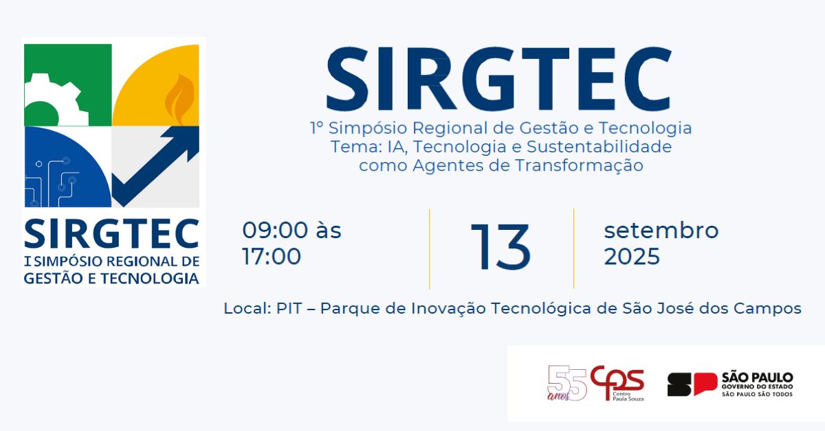 No próximo sábado, 13 de setembro de 2025, acontece o 1º Simpósio Regional de Gestão e Tecnologia (SIRGTEC), no Parque de Inovação Tecnológica de São José dos Campos (PIT).
